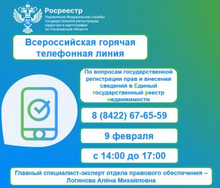9 февраля Росреестром запланировано проведение всероссийской горячей телефонной линии по вопросам государственной регистрации прав и внесения сведений в Единый государственный реестр недвижимости.
