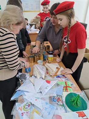 В фойе Дома культуры работал пункт сбора гуманитарной помощи. Юнармейцы, учащиеся первой школы организовали мастер-класс по изготовлению блиндажных свечей. Ребята волонтерского отряда «Доброе сердце» помогали всем желающим написать письма участникам специальной военной операции.