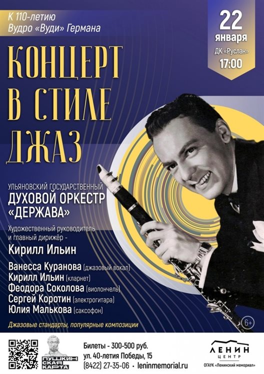 Произведения Вудро «Вуди» Германа, а также другие золотые джазовые стандарты и хиты «Эры свинга» - Дж. Гершвина и Б. Гудмена, А. Шоу исполнит биг-Бэнд Ульяновского государственного духового оркестра «Держава» (руководитель и кларнетист - Кирилл Ильин). Компанию составят Ванесса Куранова (джазовый вокал), Феодора Соколова (виолончель), Сергей Коротин (электрогитара), Юлия Малькова (саксофон).