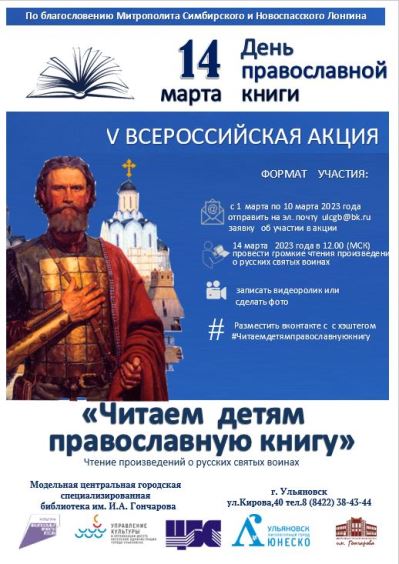 1 марта 2023 года в Ульяновске стартует V Всероссийская акция «Читаем детям православную книгу» . Акция приурочена ко Дню Православной книги, который отмечается ежегодно 14 марта и пройдет по благословению Высокопреосвященнейшего Лонгина, Митрополита Симбирского и Новоспасского.