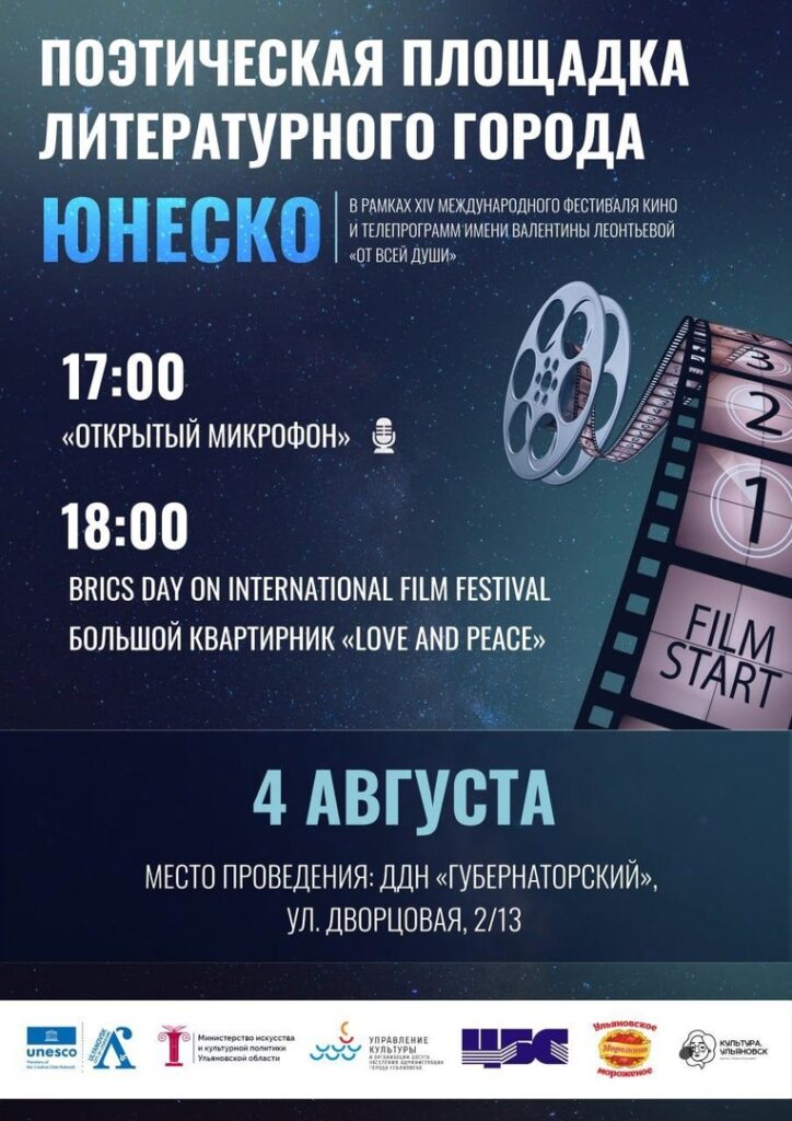 Напомним, что с 1 по 5 августа в городе будет проходить XIV Международный кинофестиваль «От всей души» имени Валентины Леонтьевой. Партнером кинофестиваля выступит Дирекция «Ульяновск — литературный город ЮНЕСКО».