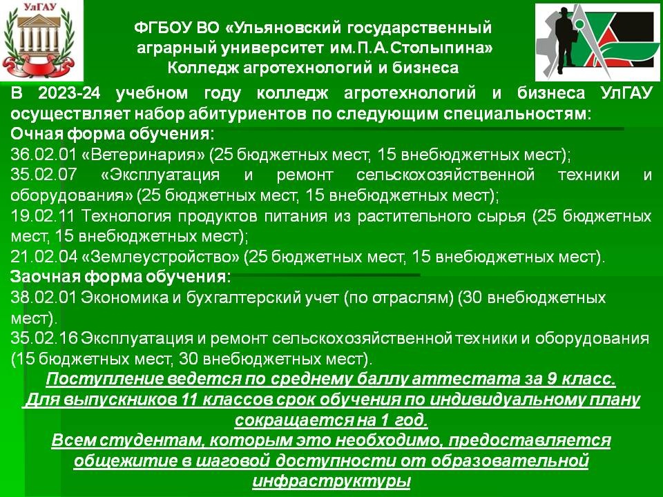 Приёмная кампания в Ульяновском ГАУ: колледж агротехнологий и бизнеса вуза ведет подготовку по 6 специальностям