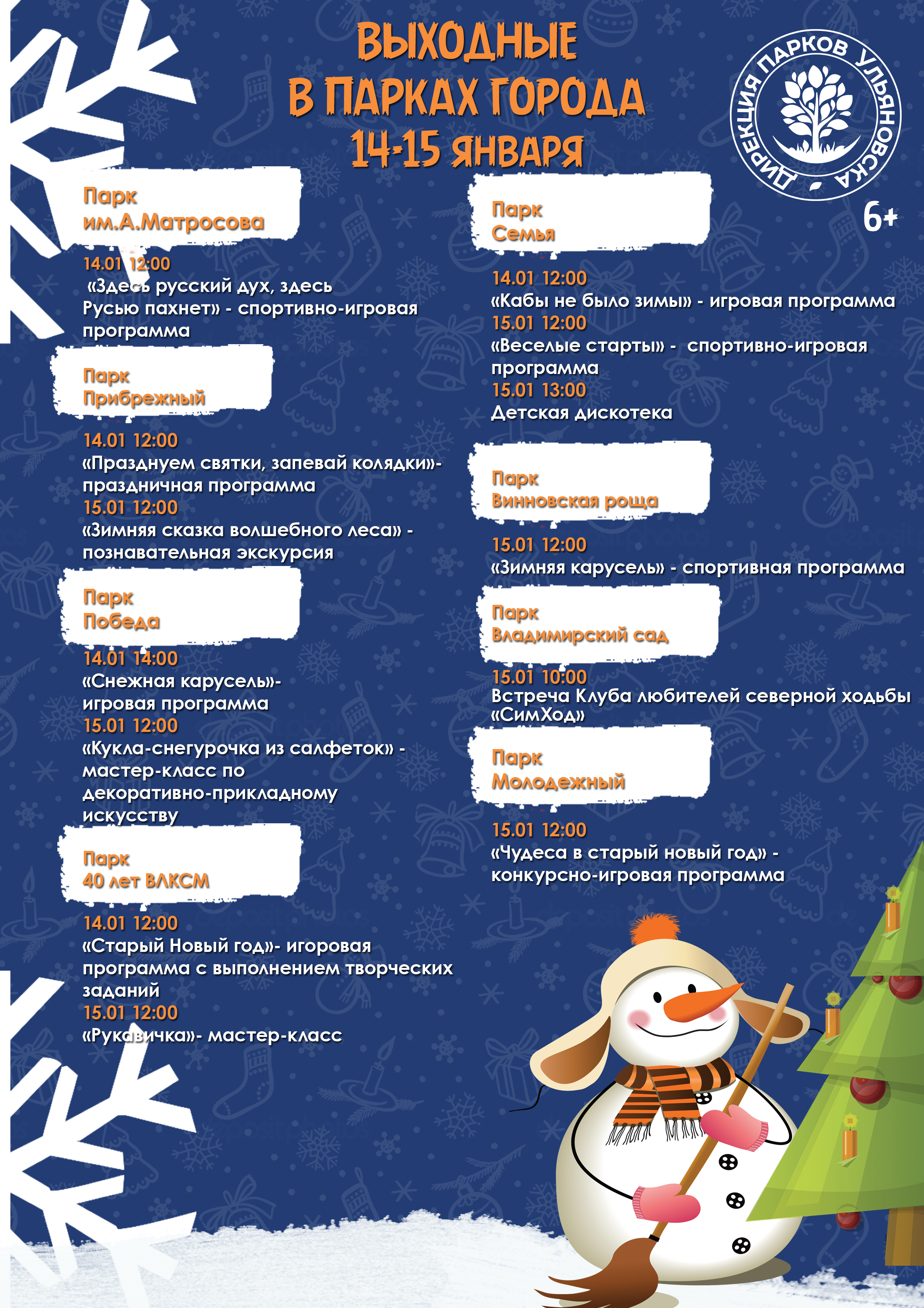 Так, в субботу в полдень в парке «Семья» в полдень состоится игровая программа «Кабы не было зимы!», а в парке «Прибрежный» – «Празднуем Святки, запевай Колядки». На следующий день в это же время в парке «40-летия ВЛКСМ» детям проведут мастер-класс «Рукавичка», в «Прибрежном» – познавательную экскурсию, а в «Семье» – весёлые старты, после которых в 13:00 начнётся детская дискотека.