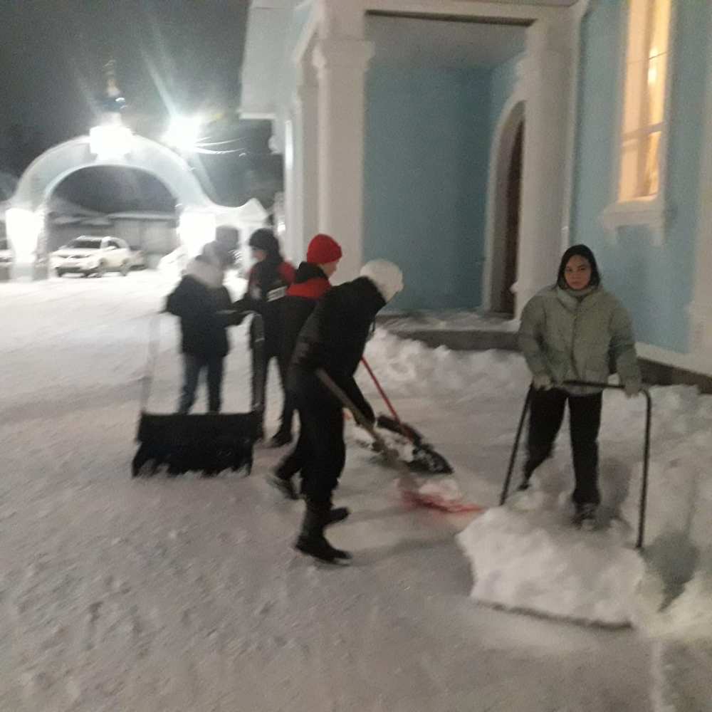Ребята волонтеры из Центра Правовой Поддержки Студентов, Службы Христианского Милосердия расчистили снег на территории городских храмов