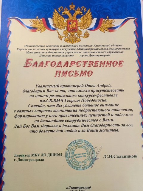 На мероприятии присутствовал клирик Свято-Георгиевского храма иерей Вячеслав Еремеев. Отец Вячеслав пожелал ребятам творческих успехов и принял от руководства ДШИ Благодарственное письмо на имя настоятеля храма протоиерея Андрея Макарова.