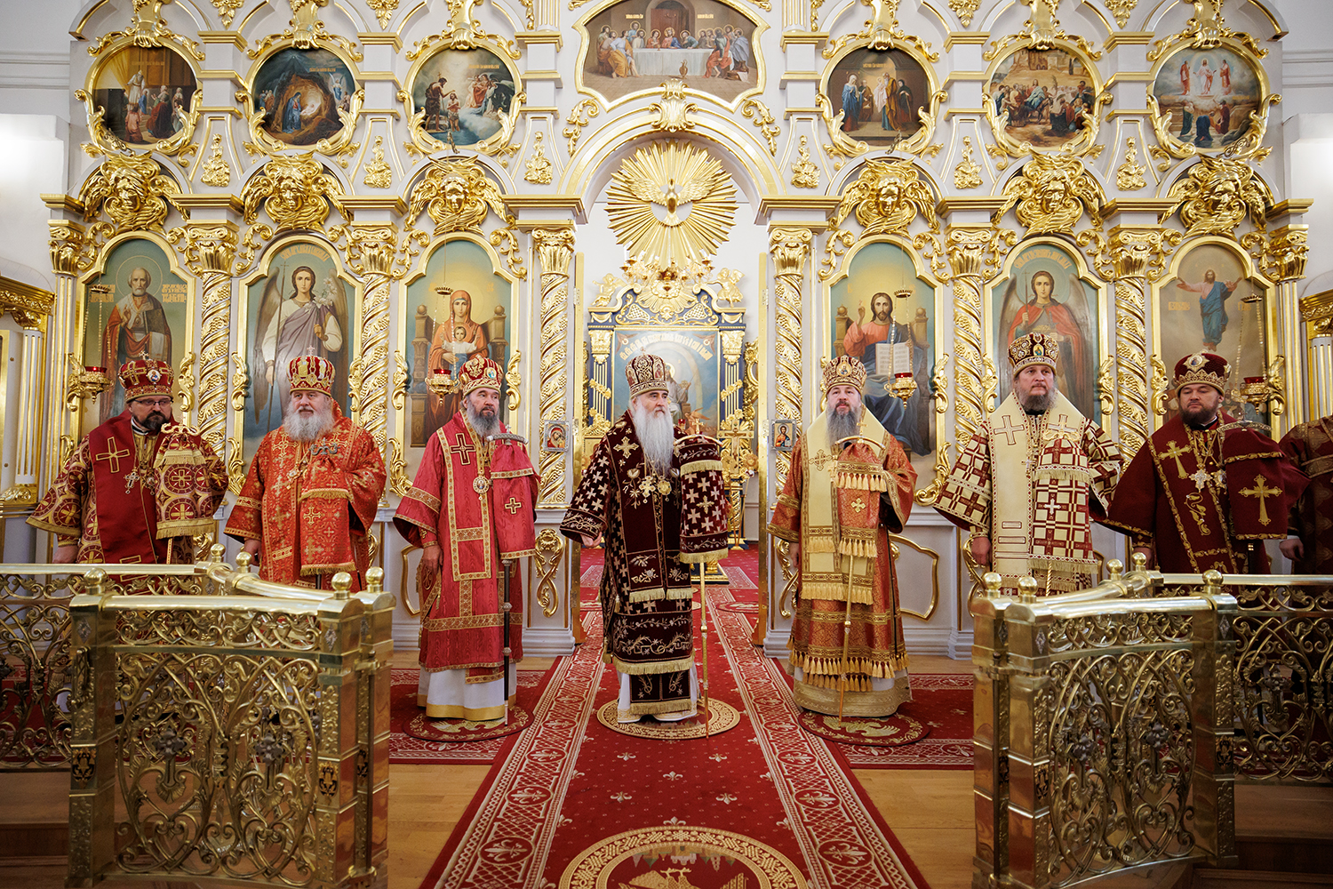 Архипастырям сослужили иерей Роман Солодко, иеромонах Прокл (Бойко), иерей Виктор Тихонов, протоиерей Илия Кузнецов, протоиерей Сергий Аристов, протоиерей Геннадий Бобров, протоиерей Олег Кропочев, протоиерей Сергей Ефремов, игумен Варфоломей (Коломацкий), протоиерей Евгений Гончаренко, протоиерей Николай Архангельский, иеромонах Георгий (Карпов), протоиерей Димитрий Пономарев, иеромонах Петр (Иванов), иерей Владимир Маняков, иерей Николай Генсицкий, протоиерей Павел Путилкин, иеромонах Иларион (Хроль), протоиерей Сергий Плехов, иерей Вадим Муругов, иерей Арсений Розин, иерей Антоний Сотников, иерей Максим Пичугин, иерей Георгий Джмиль, протодиакон Николай Платонов, диакон Иоанн Косяков, диакон Григорий Шевченко, диакон Сергий Чернов.