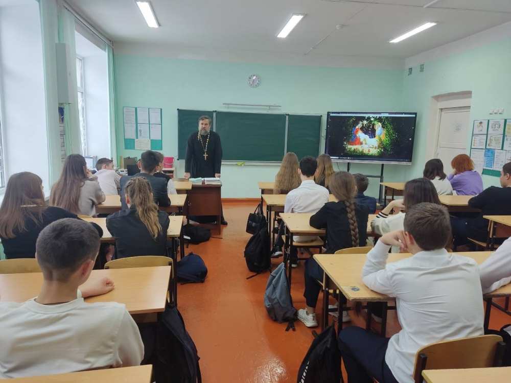 25 декабря 2024 года в рамках XXXIII Епархиальных Рождественских чтений "80-летие Великой Победы: память и духовный опыт поколений", в средней общеобразовательной школе п. Мирный состоялась встреча учащихся 9-11 -х классов с протоиереем Василием Ивановым, настоятелем храма вмц. Ирины.