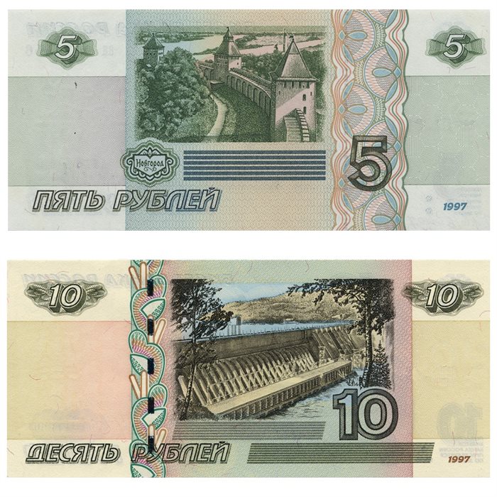 Говоря про образец 1997-го, на пятирублевой были изображены памятник «Тысячелетие России» на фоне Софийского собора в Великом Новгороде и стена Новгородского кремля. А на десятирублевой - часовня в Красноярске и мост через реку Енисей.