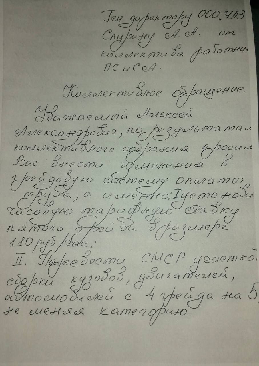«Гендиректору ООО УАЗ Спирину А.А. от коллектива работников ПС и СА.
