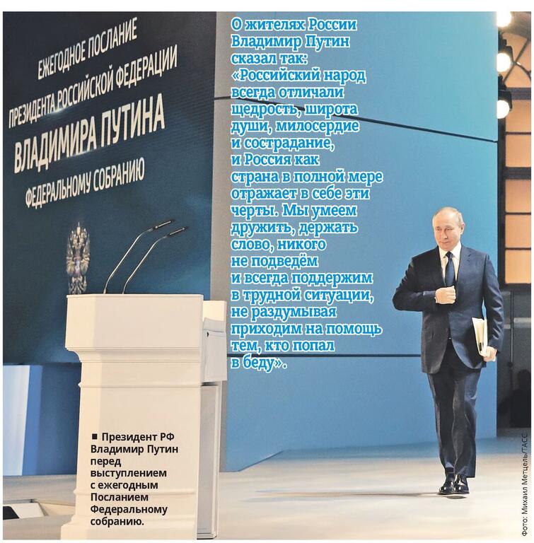 которые снабжают фронт, строителям, которые возводят укрепления и восстанавливают жильё, дороги, гражданские объекты, рабочим и инженерам оборонных заводов, которые работают сейчас практически круглосуточно, в несколько смен, сельским труженикам, которые надёжно обеспечивают продовольственную безопасность страны. Благодарю учителей, которые искренне заботятся о молодых поколениях России, особенно тех преподавателей, кто работает в сложнейших, по сути прифронтовых, условиях; деятелей культуры, которые приезжают в зону боевых действий, в госпитали, чтобы поддержать солдат и офицеров; волонтёров, которые помогают фронту и мирным жителям; журналистов, прежде всего, конечно, военных корреспондентов, которые рискуют на передовой, чтобы рассказать всему миру правду; пастырей российских традиционных религий, военных священников, чьё мудрое слово поддерживает и вдохновляет людей; государственных служащих и предпринимателей, — всех, кто исполняет свой профессиональный, гражданский и просто человеческий долг». Завершая свое Послание Федеральному собранию, Владимир Путин отметил: Россия ответит на любые вызовы, потому что все мы — одна страна, один сплоченный народ, мы уверены в своих силах, правда — за нами.