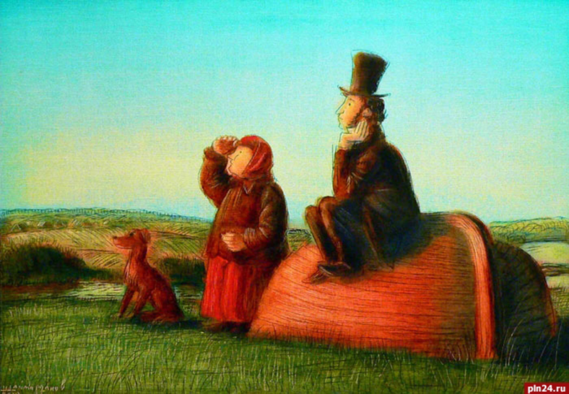 Художник Игорь Шаймарданов делает пушкинские серии с 2000 года. "Пушкин деревенский", "Пушкин - друг зайцев", "Веселый Пушкин", "Пушкин и Арина Р." - так забавно называются циклы его картин. Главный русский поэт в них то сельский житель, простой и чуть наивный, то сказочный герой: то ли Иванушка, то ли царевич, которому служит не только серый волк, а вся живность.