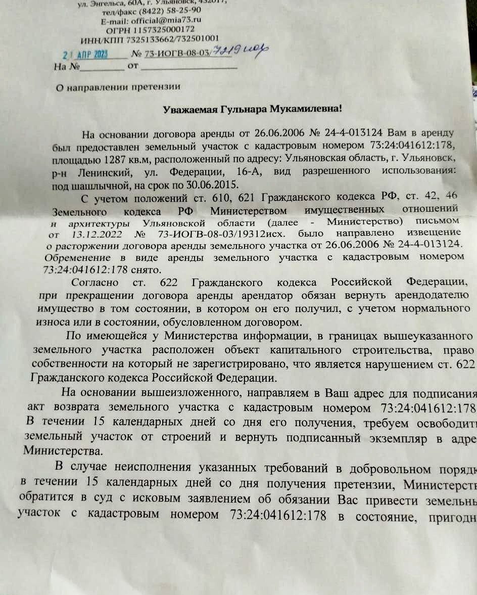 «Просим Вас рассмотреть вопрос отмены решения Министерства имущественных отношений и архитектуры Ульяновское области в адрес знаменитой шашлычной на Федерации. По указу ведомства решено было прекратить договор аренды земельного участка, где располагается заведение. Кадастровый номер (73:24:041612:178).