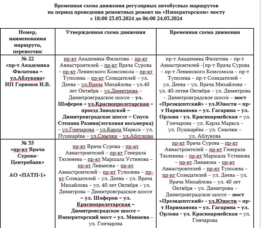 На фото представлена временная схема движения регулярных автобусных маршрутов на период проведения ремонтных ремонт на Императорском мосту. Администрация Ульяновска приносит автовладельцам извинения за доставленные неудобства и просит продумывать свой маршрут с учетом временных изменений.