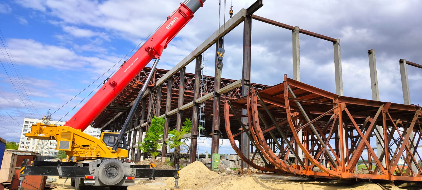 Каждая металлическая ферма, из которой состоит стропильная система кровли манежа, имеет длину 84,4 метра, ширину – 3,2 метра, а её вес превышает 55 тонн. В процессе снятия сборных металлоконструкций два автокрана грузоподъёмностью 80 тонн синхронно опускают их на специально подготовленную площадку.
