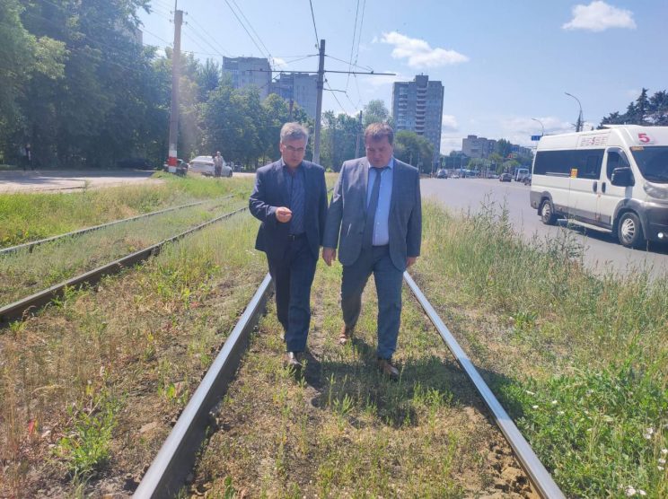 Глава администрации Засвияжского района Ульяновска Наиль Юмакулов (слева) и глава Ульяновска Александр Болдакин (справа) осматривают результаты работы минитрактора по покосу травы между рельсами, июнь 2023 года