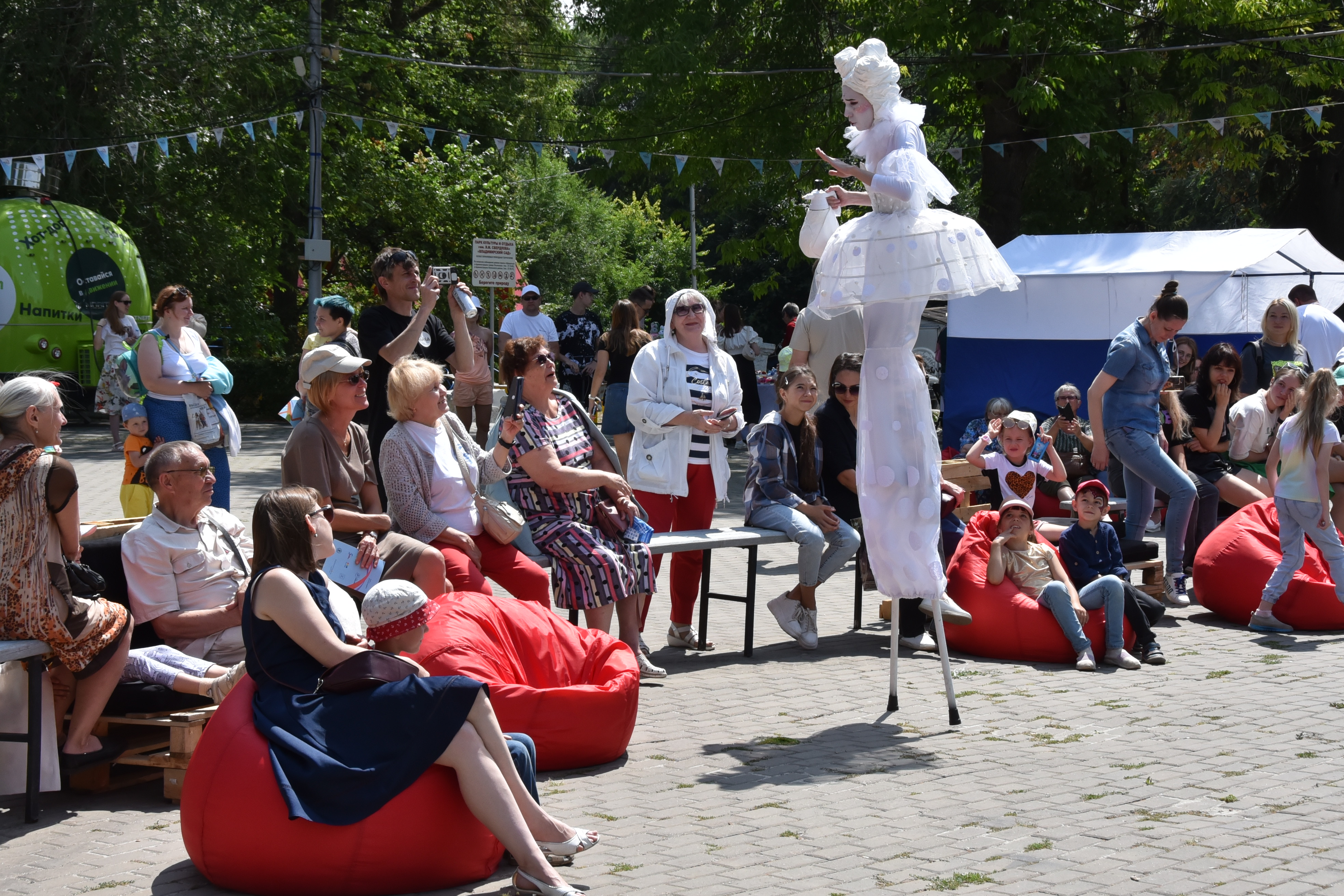 От проекта «Другое дело» подготовлена обширная развлекательная программа, это интерактивные станции, аквагрим, цирк, квиз, квест по парку, выступление кавер дуэта «Апрель», иллюзиониста Михаила Бородатого, живые статуи театра «Луна».