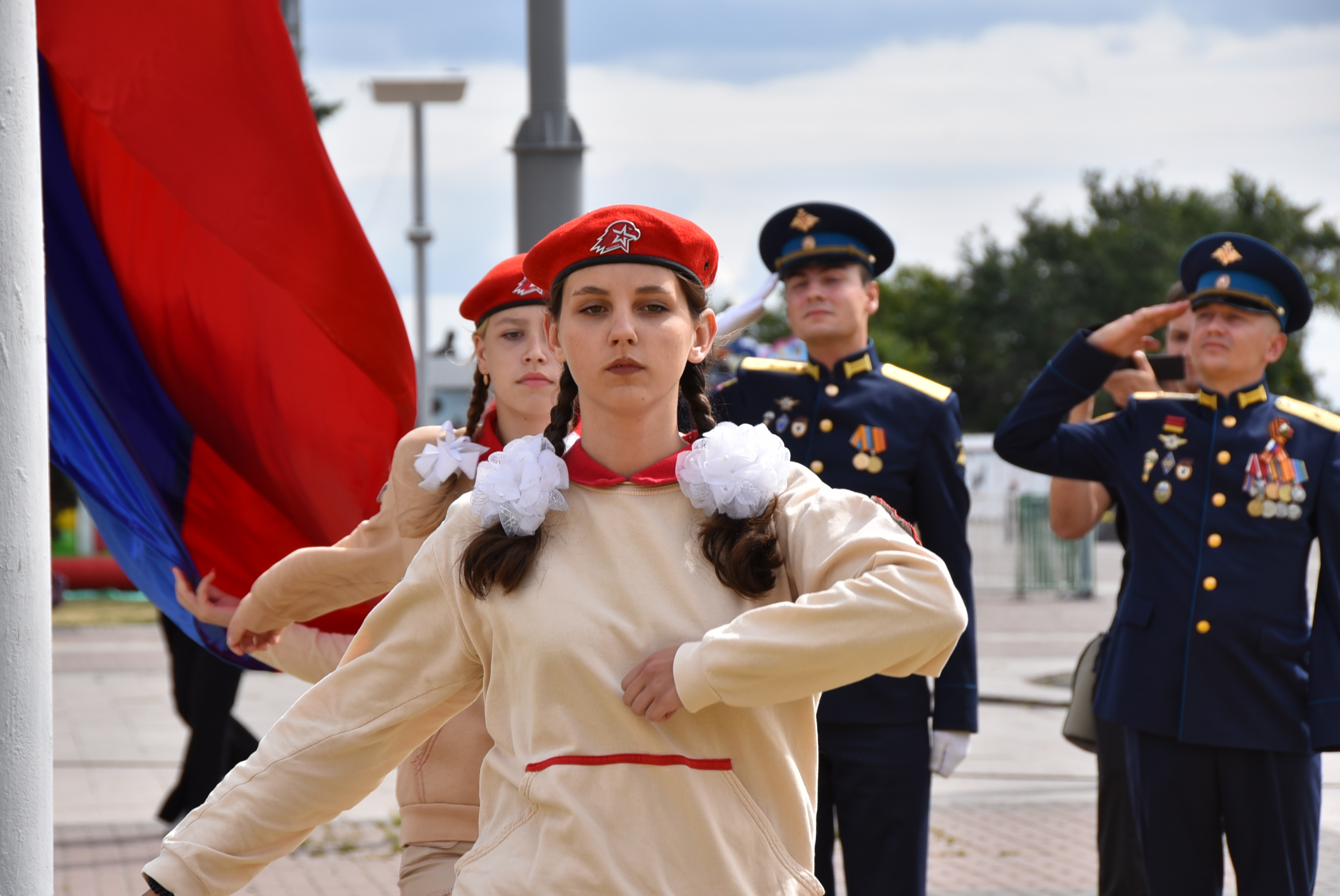В церемонии поднятия Государственного флага приняли участие начальник штаба регионального отделения юнармии Владимир Ульянов и участник СВО Владимир Верховодка.