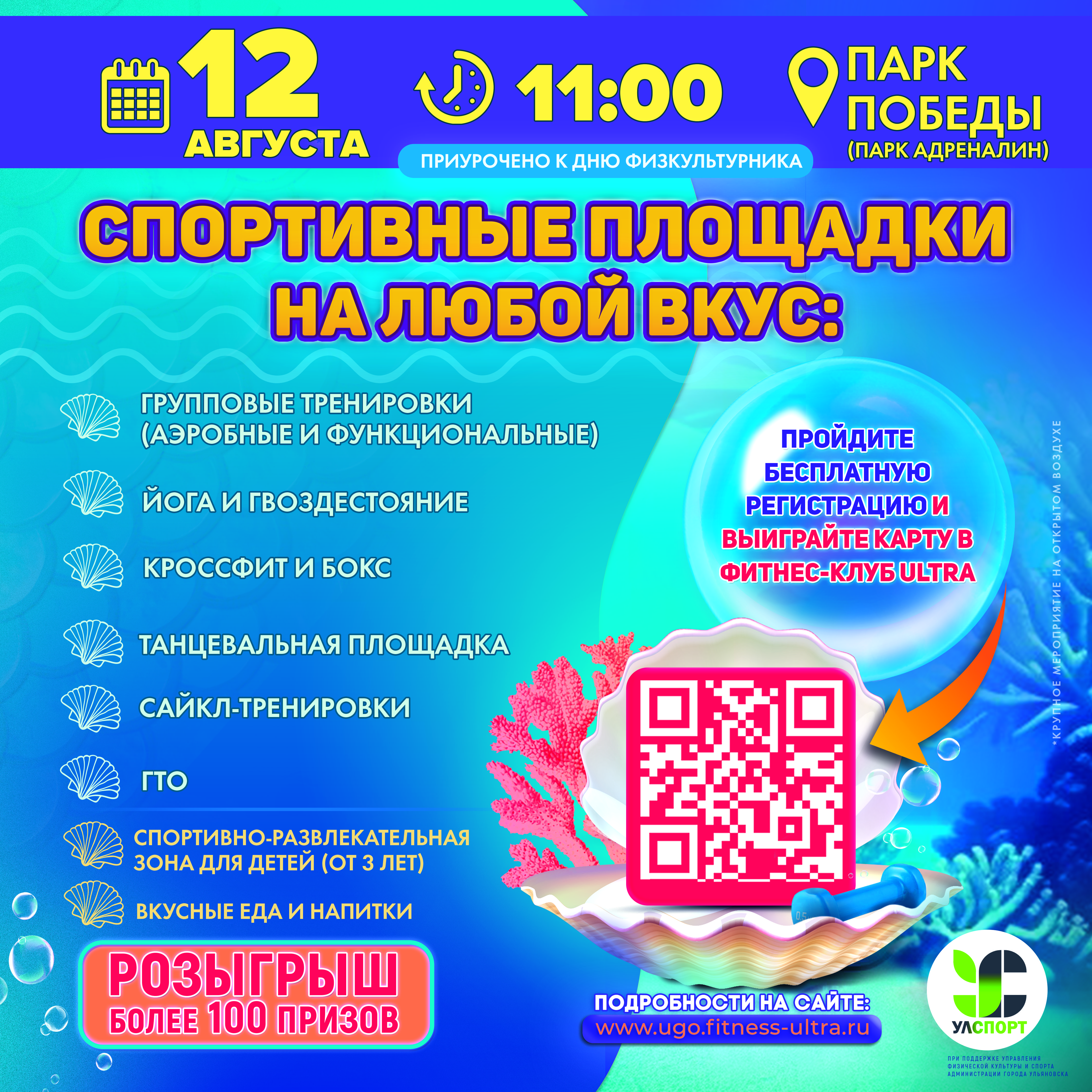 В этом году фестиваль посвящен теме подводного мира. Его гостей ждет множество мастер-классов по фитнесу, йоге, гвоздестоянию, кроссфиту, сайклингу и танцам, тематические площадки и развлекательная зона для детей, красочная фотозона и вкусные угощения, а также подарки.
