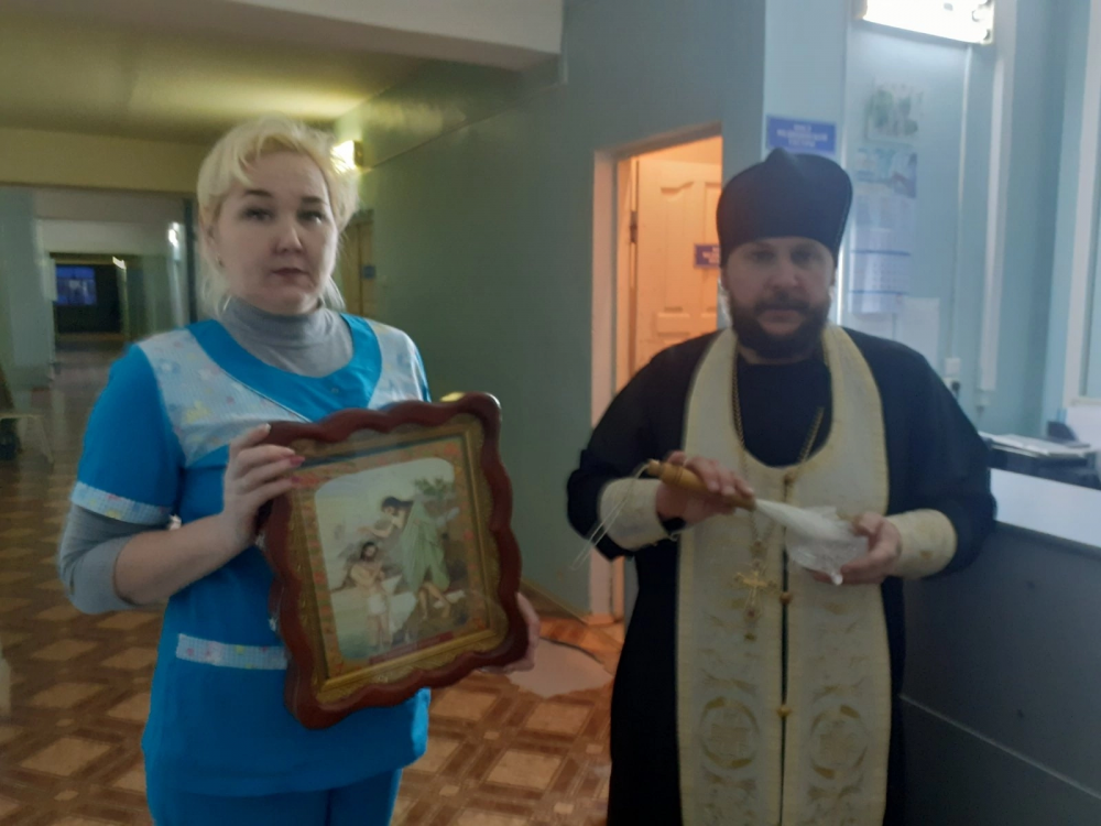 Отец Алексей окропил богоявленской водой отделения терапии и пациентов, которые проходят сейчас лечение. Поздравил всех с праздником и пожелал крепкого здоровья. Приход: Храм св. великомученика Димитрия Солунского с. Новая Малыкла