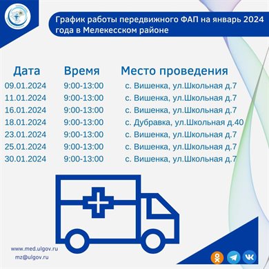 В течение января мобильный ФАП будет путешествовать по населенным пунктам Мелекесского района. Уже завтра, 9 января мобильный фельдшерско-акушерский пункт начнет работу в селе Вишенка.