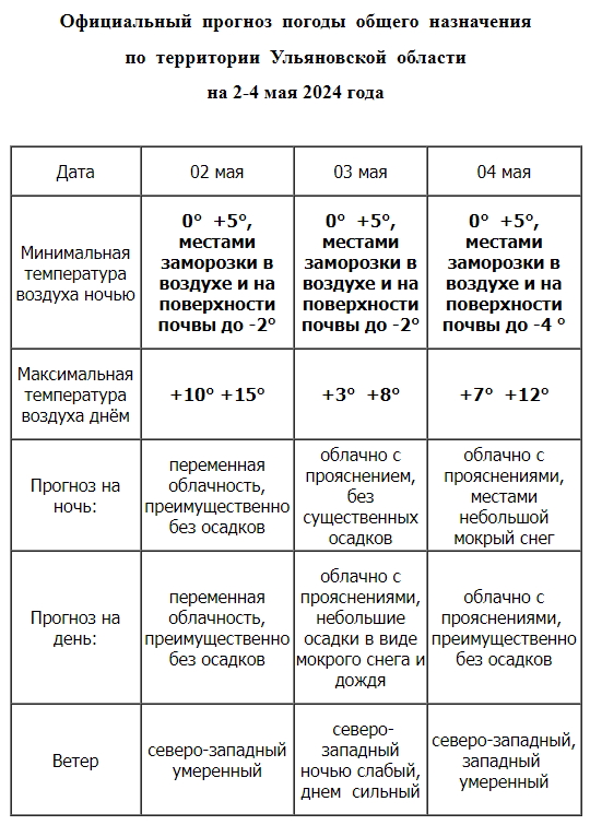 Более того, службы дали штормовое предупреждение об опасном явлении на предстоящие выходные. Ночью и утром 4-5 мая в большинстве районов Ульяновской области ожидаются заморозки в воздухе и на поверхности почвы -1°…-5°.