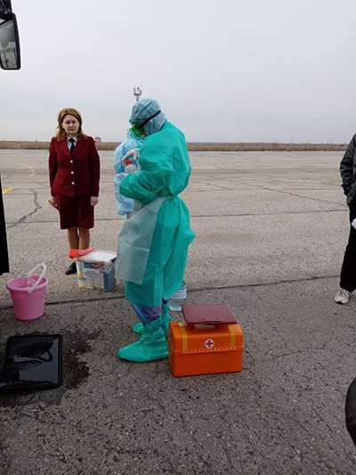 Медицинский работник организовал осмотр и опрос больного и поставил первичный диагноз «Холера?». Информация с борта воздушного судна была передана по схеме оповещения межведомственного плана. Больной каретой скорой помощи был доставлен в инфекционную больницу. Контактные лица эвакуируются в изолятор.